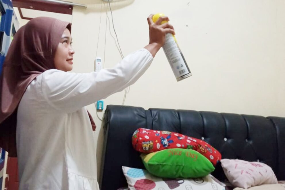 Sebelum melakukan penyemprotan, wajib bagi Anda sebagai orang tua untuk memastikan tidak ada orang di dalam kamar. Hal ini bertujuan untuk menghindari gangguan pernapasan dan iritasi pada kulit. Pakailah masker untuk menghindari masuknya zat kimia berbahaya saat Anda bernafas.