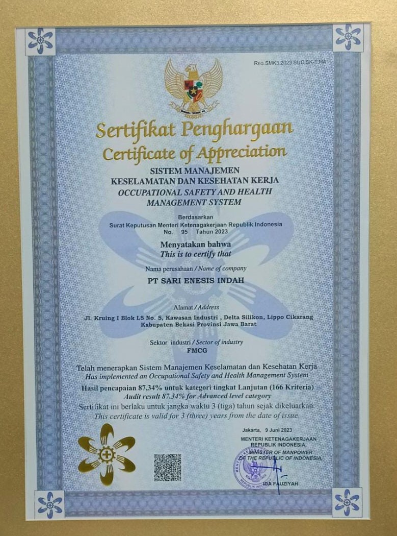 Mr. Fahmi Syaiful as Head of HSE Cikarang stated “of course we are proud and we should be grateful because this is part of the appreciation from the Government, especially the Ministry of Manpower (Kemnaker) in the form of K3 Awards to parties who have successfully implemented K3, one of which is PT. SARI ENESIS INDAH CIKARANG who was summoned to receive the K3 award in the SMK3 category by achieving a gold certificate, out of a total of 288 companies that have successfully obtained an SMK3 certificate in 2023. But it cannot be separated from receiving the award, what is clear is that our active role is that we must always strive to continue to cultivate K3 culture in the environment in which we work”.