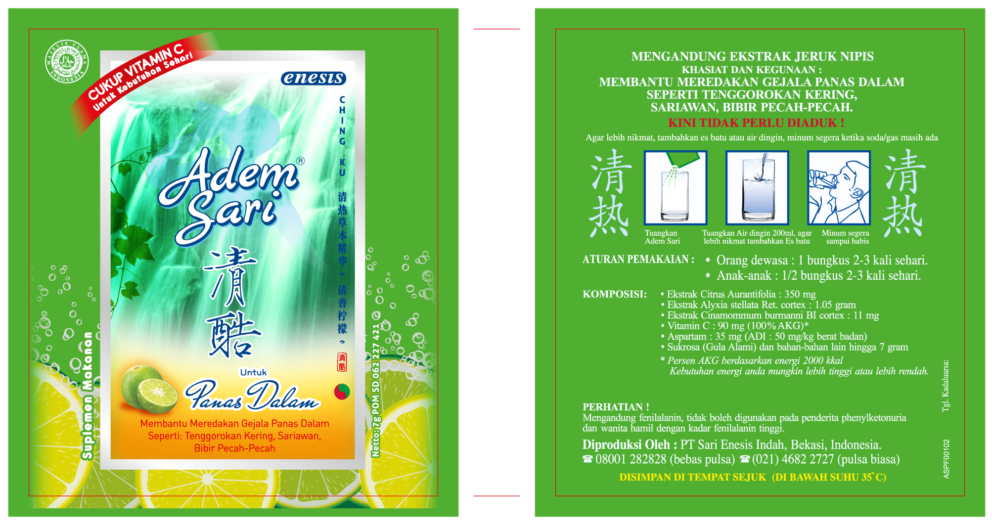 Although Adem Sari already changed its packaging, but for the composition and efficacy of Adem Sari remain the same with the old packing Adem Sari. “In terms of composition and efficacy are still the same, only now Adem Sari has a new communication that is” Now More Practical, No Need to Mix “and eliminate the uncomfortable feeling after eating,” said Heryanto (Product Manager of Adem Sari).